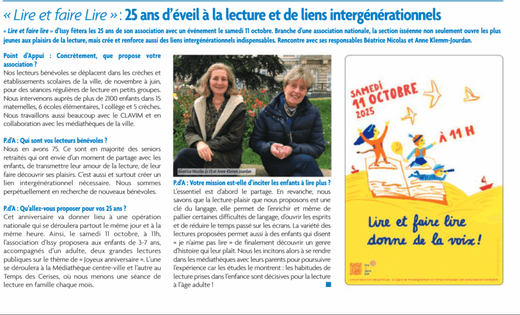 En octobre 2025, le journal local « Point d’Appui » a consacré un article pour les 25 ans de Lire et faire lire.